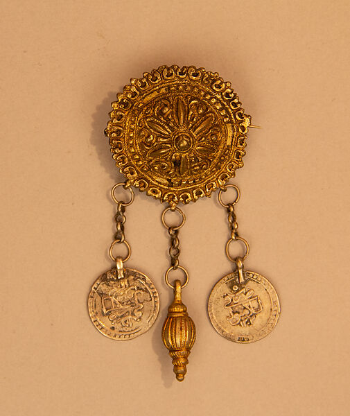 This small ornament has a pin on the verso that suggests that it would originally have been worn fastened to a piece of clothing or a cloth headdress. Two decorative silver coins are attached to the pin. They have been stamped in emulation of eighteenth-century Ottoman currency and specifically modeled on coinage used in the year A.H. 1203 (A.D. 1797) during the reign of Sultan Selim III. The use of coins and decorative coins in jewelry is an ancient practice across the Islamic world. This particular usage of coins references the way in which jewelry served as a form of portable wealth for the women who owned such pieces and could be sold if needed. These coins were probably copied from discontinued currency that was available in Tunisia during and after the Ottoman presence in North Africa.