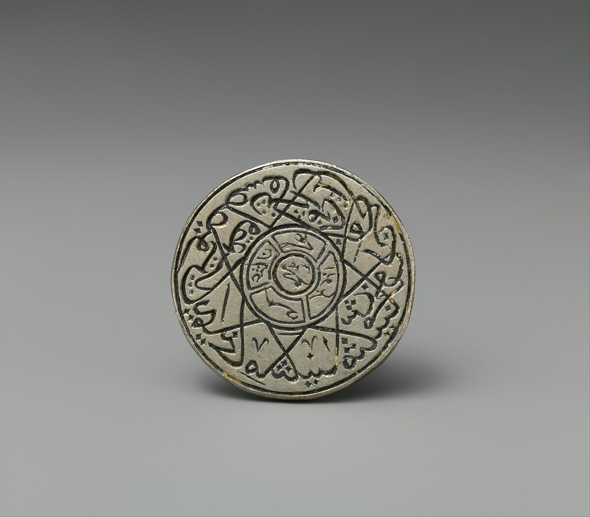 The punctured stem of this stamp seal suggests that a well-to-do individual may have worn it as a pendant. The star includes the names of the Rashidun ("Rightly Guided") caliphs and the Prophet Muhammad. The names of the Seven Sleepers of Ephesus and their dog Qitmr, the subject of the miraculous story from the Sura al-Kahf (Of the Cave, 18) from the Qur’an, which is often revered for its talismanic qualities, imbue the stamp and its impression with a protective aura.