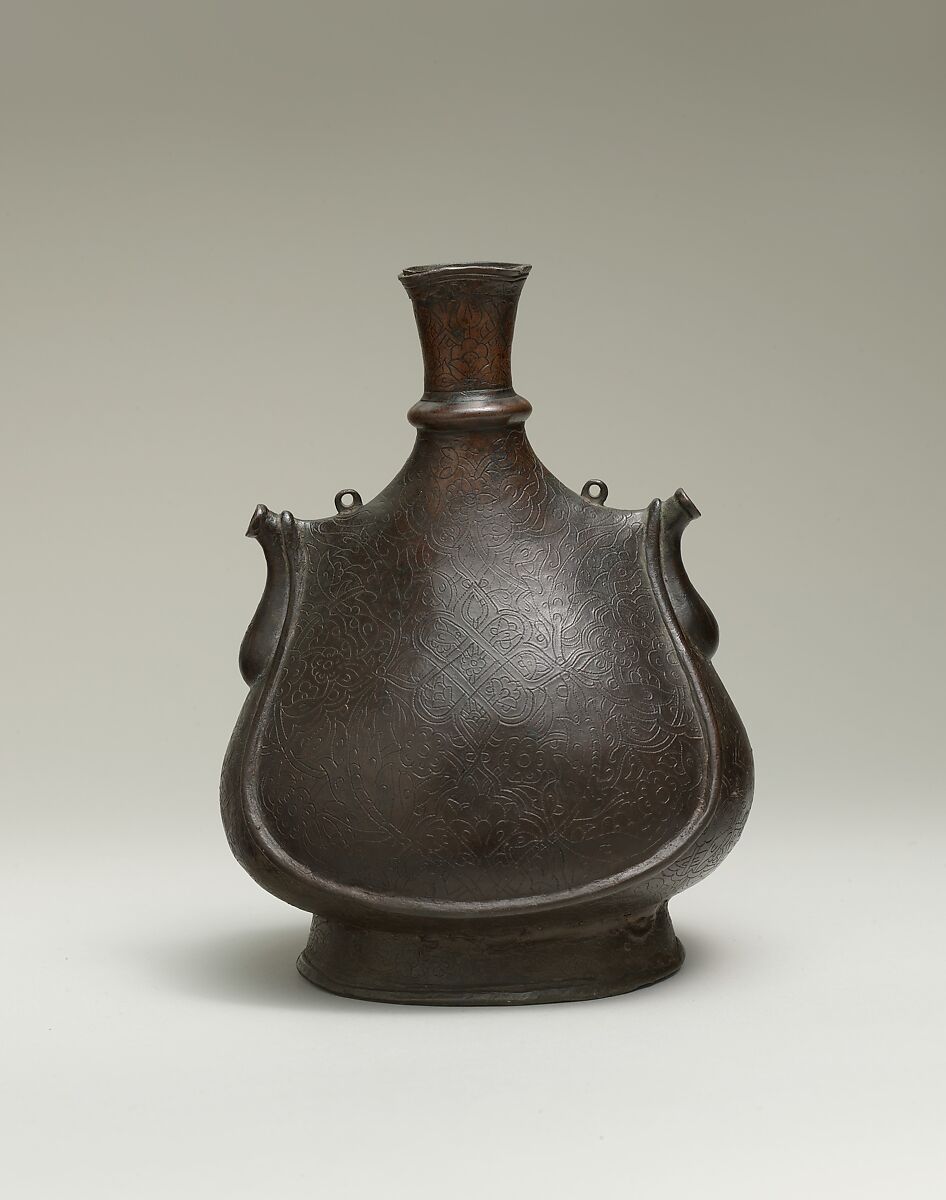 Imitating the shape of more portable leather prototypes, this so-called pilgrim flask is cast in copper. Originally covered in a type of gilding referred to as tombak, this piece still displays traces of its once golden sheen. Leather flasks were a standard part of equestrian equipment, and were popular among the Ottomans. Luxury examples such as this, however, probably served as emblems of rank.