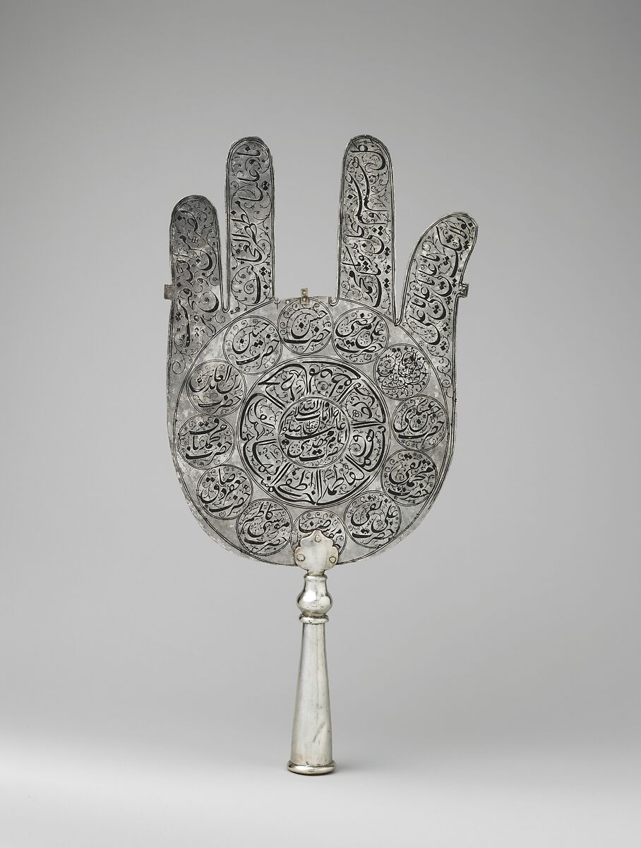 Under the Ottomans, Safavids, and Mughals, steel or silver standards were used in military, royal, and religious ceremonies. The talismanic power of this standard ('alam) is understood through the choice of the inscriptions. On one side, in the centermost circle, the Shi'i prayer venerates the Prophet Muhammad's family through his cousin and son-in-law 'Ali, his wife Fatima, and their sons Hasan and Husain, supported by the protective Throne verse (2:255). The other side honors the twelve imams, with the name of the twelfth imam enclosed in the central circle. As for the fingers, they are incomplete and display a combination of Qur'anic verses and popular Shi'i invocations. The power of the names of these religious figures, the Qur'anic verses, and the Shi'i prayers endow this standard with its amuletic properties.