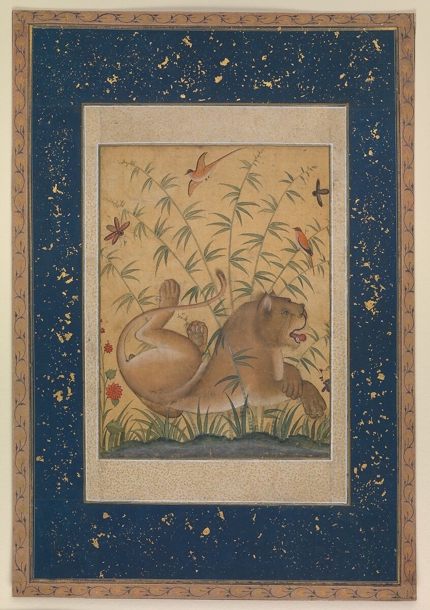 The Mughals had a great predilection for Indian fauna. Muraqqa (single-page) paintings with animal portraiture developed into a separate genre during the Mughal period. For the Mughals, lions symbolized power and when accompanied by a lamb or calf signified the existence of peace and justice. This painting, one of the early works of Mansur, belongs to the period of Akbar and shows a resting lion reclining in the bulrushes besides the edge of a lake where birds perch and flit amidst the bamboo grove. The lion raises his hind legs while lightly crossing the fore paws in one of his natural poses. The sense of an idyllic landscape is enhanced by insects hovering in search of flowering plants. The three different size borders that frame the painting are embellished with ghubara (fine gold sprinkling) and shafaq (coarse gold application) technique, and the outer most with stylized floral and leaf motifs on a slender vine.