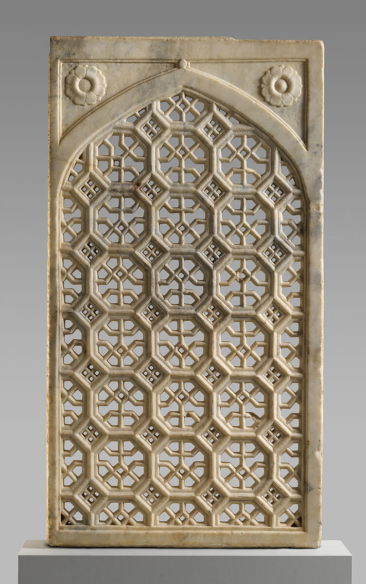 Pierced screens of pink sandstone or white marble were widely used in Mughal India and fulfilled many architectural functions, serving as windows, room dividers, and railings. They allowed for the circulation of air and provided shelter from sunlight, but the geometric patterns and their reflections also yielded aesthetic effects. A diaper pattern of octagons and small interstitial lozenges outlined by thick frames forms the main surface; behind this pattern is a second grid, which consists of staggered rows of octagons interwoven with lozenges connected by vertical bars that extend through the centers of the alternating rows of hexagons. The overall pattern, created with outstanding technical skill, is engaging but not entirely succesful, since the thick frames of the elements that make up the first grid prevent an appropriate geometric and aesthetic reading of the second and more complex level of the composition.