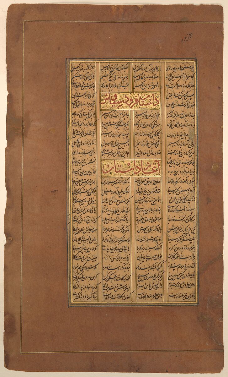 - Title:Page of Calligraphy from a Shahnama (Book of Kings) of Firdausi