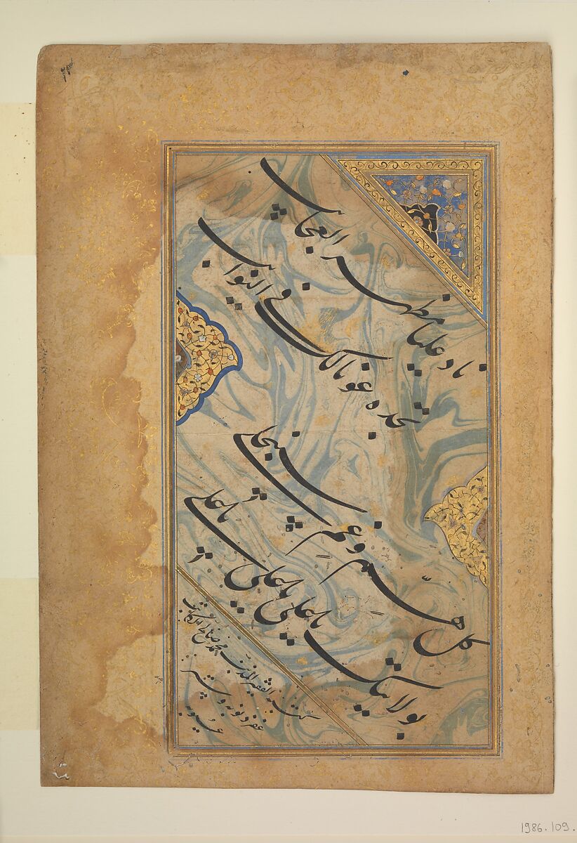 This leaf of fine nasta'liq calligraphy was conceived as an artistic endeavor, in which the writing is integrated with the ornamental background. The decorative technique of marbleizing paper spread from Iran to Turkey and to India, particularly to the Deccan. Nasta'liq calligraphy, originally employed in Iran, had also been favored in India since the late sixteenth century. Here, the scribe was very conscious of the rhythms and balances of the horizontal and vertical letters, written diagonally. The strong black ink against the gentle swirls of the smoky blue and pale beige of the marbleized design gives the impression that the letters are floating, adding a mystical dimension to the page.