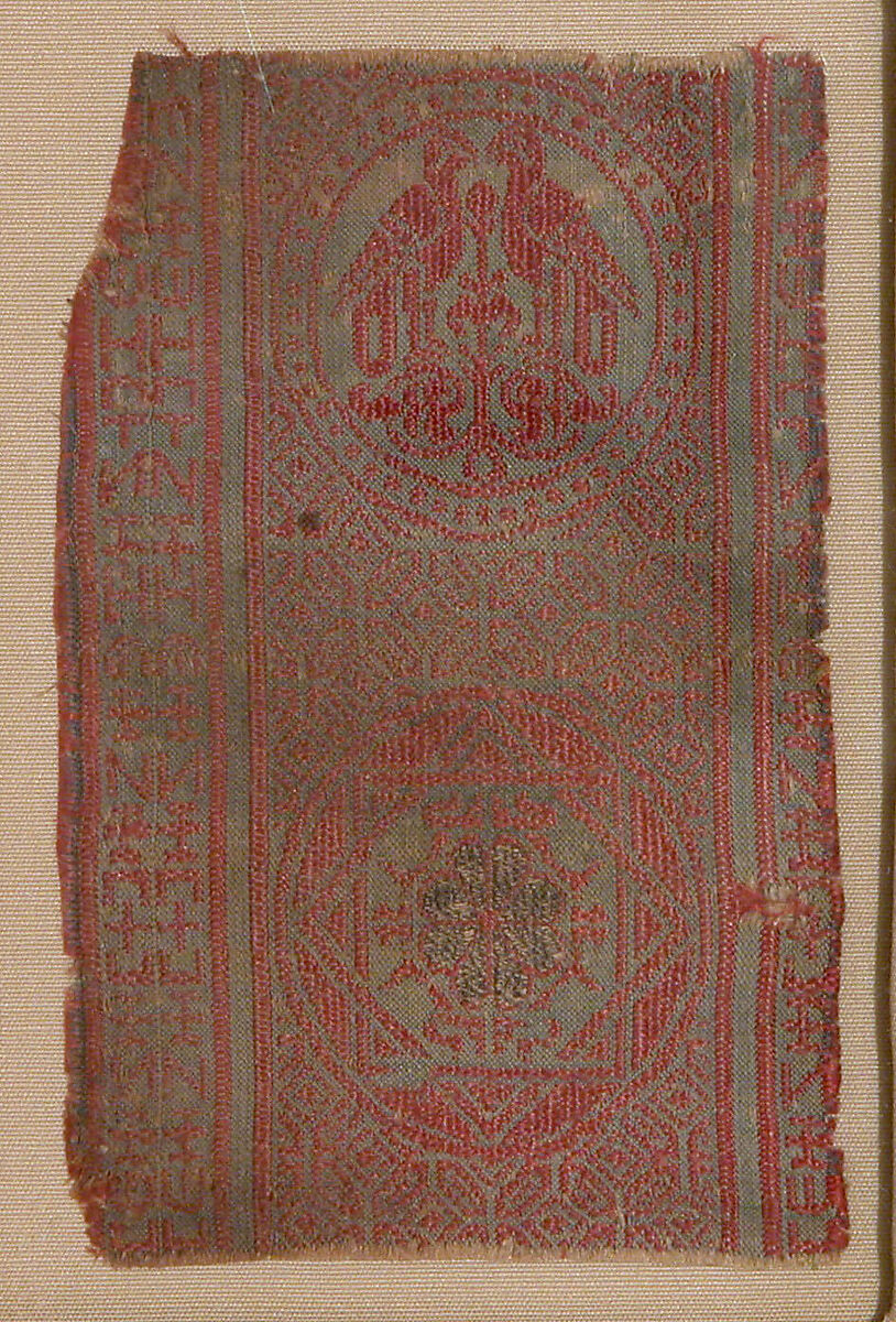 This rectangular silk textile fragment is decorated with two roundels within a vertical band surrounded by geometric patterning. The top roundel consists of a pearl border, containing two confronted birds flanking a plant or tree. The bottom roundel comprises a six-petalled flower within an eight-point star.