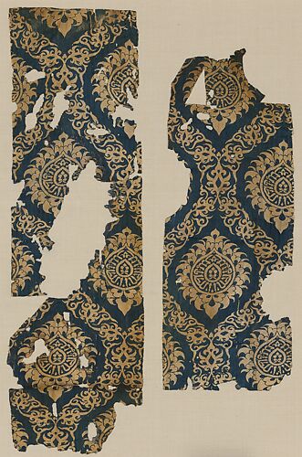 The design of this silk fragment consists of three rows, each containing three compartments. Pearl borders, floral motifs, palmettes and pendants predominate the ornamental repertory here. The center square is filled with four birds, each set within its own small circle. Silks with relatively simple color schemes like this one were probably purchased by local elites, who used smaller pieces to decorate their clothes.