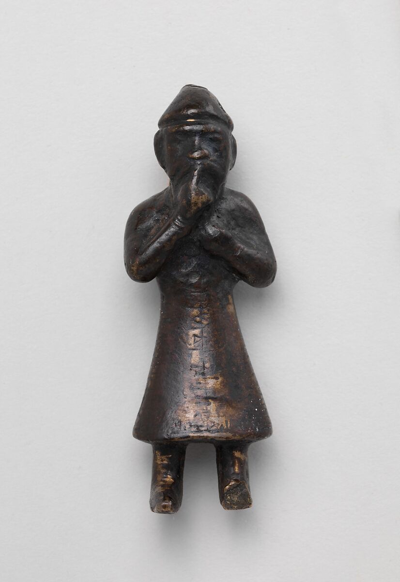 This small bronze figure, whose original use is unknown, represents a standing man wearing garments which are traditionally associated with Turkic traditions, such as the long flaring coat and the pointed hat. The gesture of holding a finger on the mouth was a sign of respect in the Achaemenid traditions in Iran, and was usually performed in front of rulers. On the coat, several inscriptions are incised in a simple Kufic, which might be of a talismanic nature.