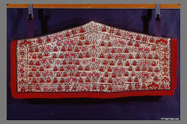 This type of embroidered camel trapping, called an asmalyk, was used in Turkoman wedding ceremonies, when the bride rides a richly adorned camel to her new home. The ornaments worn by the camel were woven by the bride, in order to demonstrate her sewing skills. These trappings were commonly woven in pile, although some were embroidered, as in this example, or created with felt appliqués. The most characteristic designs and colors are those that symbolize fertility, such as a lattice pattern called ahik, fashioned in red on a white ground. The main field of this five-sided panel consists of rows of hanging blossoms in red wool, punctuated by five columns of volute-shaped blossoms in pink silk. It is bordered with an alternating design of blossoms and quartered rosettes, with a surrounding band in blue and red flat weave.