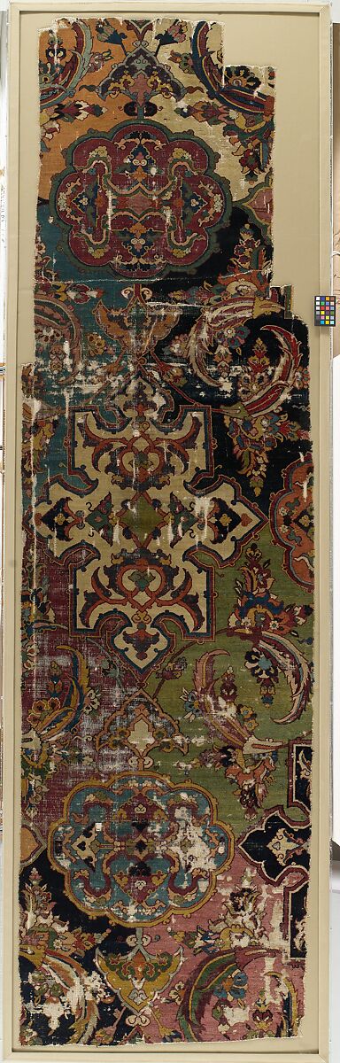 With its rich pattern and extensive color palette, this large fragment once formed part of a magnificent carpet. This piece exhibits the use of jufti (or paired) knotting, characteristic of a small group of carpets and carpet fragments attributed to the northeastern Iranian province of Khurasan. The carefully-drawn flowers, incorporating serrated, curling leaves, resemble those of the so-called sāz style, which became popular in Iran and Turkey in the sixteenth century.