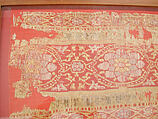 A substantial body of textiles, of which some have only recently come to light, can be tentatively assigned to one of the imperial workshops established by the Mughal emperor Akbar (r. 1550–1605) during the late sixteenth century. Although similar in material, color, and structure, these textiles have highly varied patterns. This example has friezes of striding Rajput warriors and riders framed above and below by joined borders featuring lotus medallions.