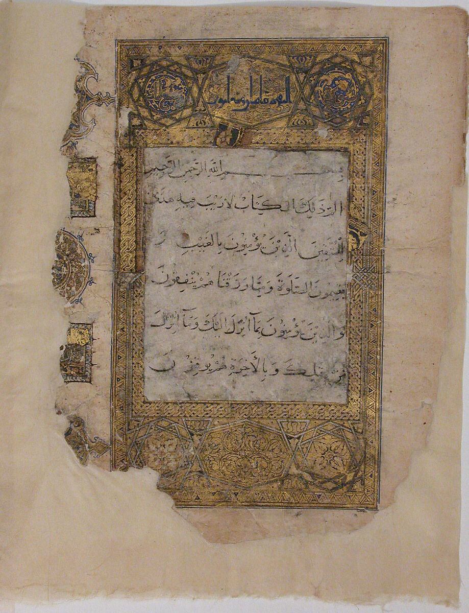 Eight folios of this dispersed Qur'an are held in the Museum collection. Among these folios is the colophon page, with the signature of the scribe Muhammad al‑Zanjani from the town of Zanjan, in northwestern Iran, and the date of completion, 531 AH/1137 CE. The text is written in the script known as eastern kufic with some elements in cursive (naskh), and is lavishly illuminated with designs of foliate scrolls and geometric interlace.
