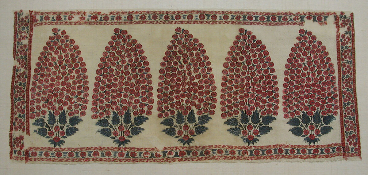 Through the eighteenth century, the ever popular flowering plants of the Shah Jahan period transformed into pinecone-shaped clusters of buds emanating from roots of stylized leaves.