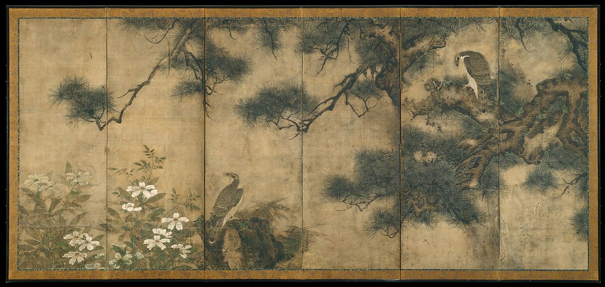 Recent scholarship has helped attribute these screens to Mitani Tōshuku, a member of the Unkoku school. Founded by Unkoku Tōgan (1547–1618), a master of the Momoyama period, the Unkoku school enjoyed longlasting patronage in southern Japan. Although he did not use the Unkoku name, Mitani Tōshuku was a prominent member of the school. The dense foliage of the pine tree, the strong chiaroscuro defining its branches, the dark shadings on the hawks, and the protective pose of the bird toward its chicks closely resemble a painting that bears Tōshuku’s seals.