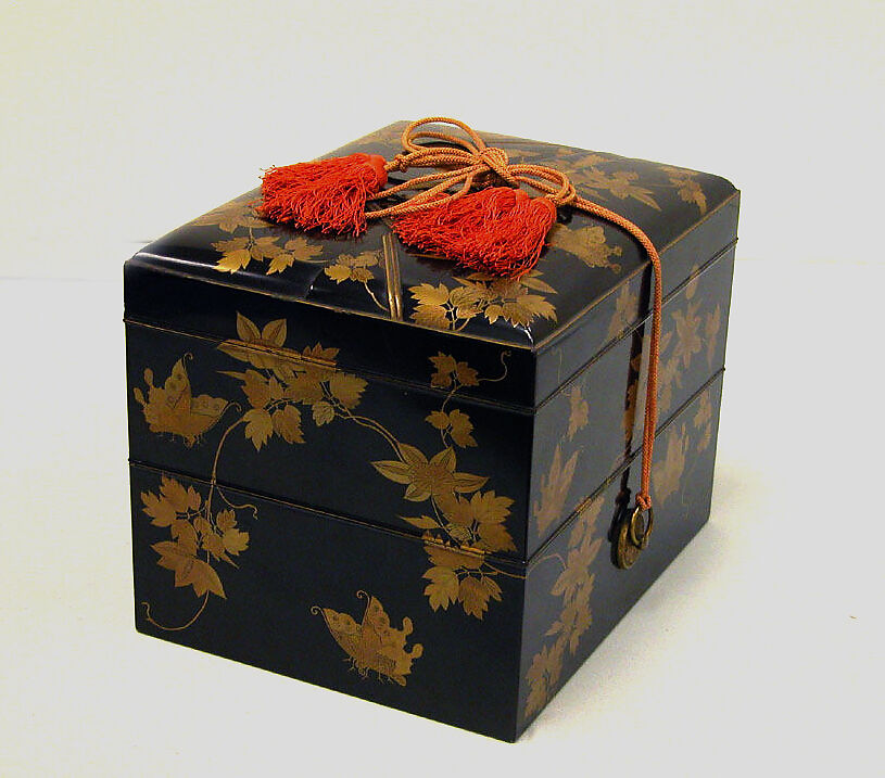 - Medium: Black lacquer decorated with sprinkled lacquer; clematis and butterfly folded incense paper design