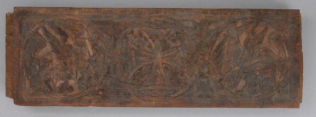 This wooden panel, possibly from a piece of furniture, is decorated with three roundels like those on textiles. A Greek cross is flanked by a pair of confronted griffins, mythological creatures whose images were often represented in the art of the ancient world.