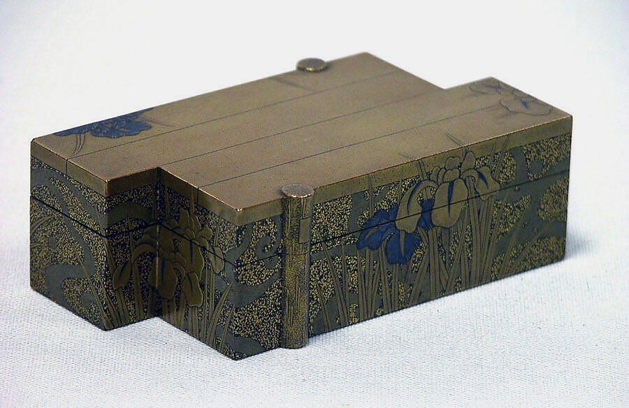 The shape of the box, in the form of two bridge planks, and the iris designs in sprinkled gold and silver evoke the "Eight Bridges" episode in Chapter 9 of The Tales of Ise.