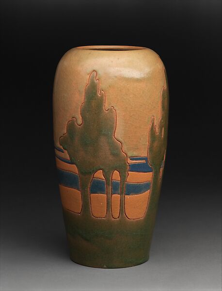 Recalling the California countryside, this vase with a stylized landscape of cypress trees is one of only a handful of known examples made by Rhead at his short-lived pottery operation in Santa Barbara, California. It exemplifies the soft, organic compositions he employed during this period, which stand in contrast to the more structured, conventionalized designs typical of other Arts and Crafts potteries.