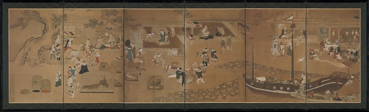 Things foreign enjoyed great popularity in sixteenth- and early seventeenth-century Japan, and a number of genre paintings in the screen format were devoted to the curiosity and artistic interest aroused by the presence of Portuguese and Spanish traders at port. The exotic costumes of Jesuit priests, Christian icons, strange animals, and oddities like clocks and guns all found their way into Japanese painting. These diminutive screens, created later in the Edo period, are a pastiche of earlier Nanban (“Southern Barbarian”) scenes, and shows the foreign traders who imported rare birds. They reprise the genre at a time when foreign presence in Japan was once again a major impact on Japanese culture after a long period of limited international relations.
