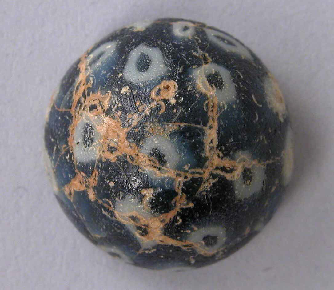 The dot-in-circle motif recalls designs presumed to be of magical significance, most likely an abstract eye to ward off the evil-eye, which serves an apotropaic function. Easily reproduced with a tool and visible in many cultures and times, this symbol may have lost its meaning, and become simply a decorative pattern, or may have one that we have not yet discovered.