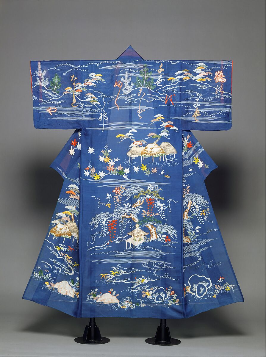 This light, unlined robe (hito-e) is designed for summer. On a blue background, flowers and plants of the four seasons appear in landscape settings. Spring flowers are represented along the hem; above them we see wisteria and other summer plants; toward the middle appear autumnal maple leaves; and around the neckline and on the sleeves are winter pine-sapling motifs.