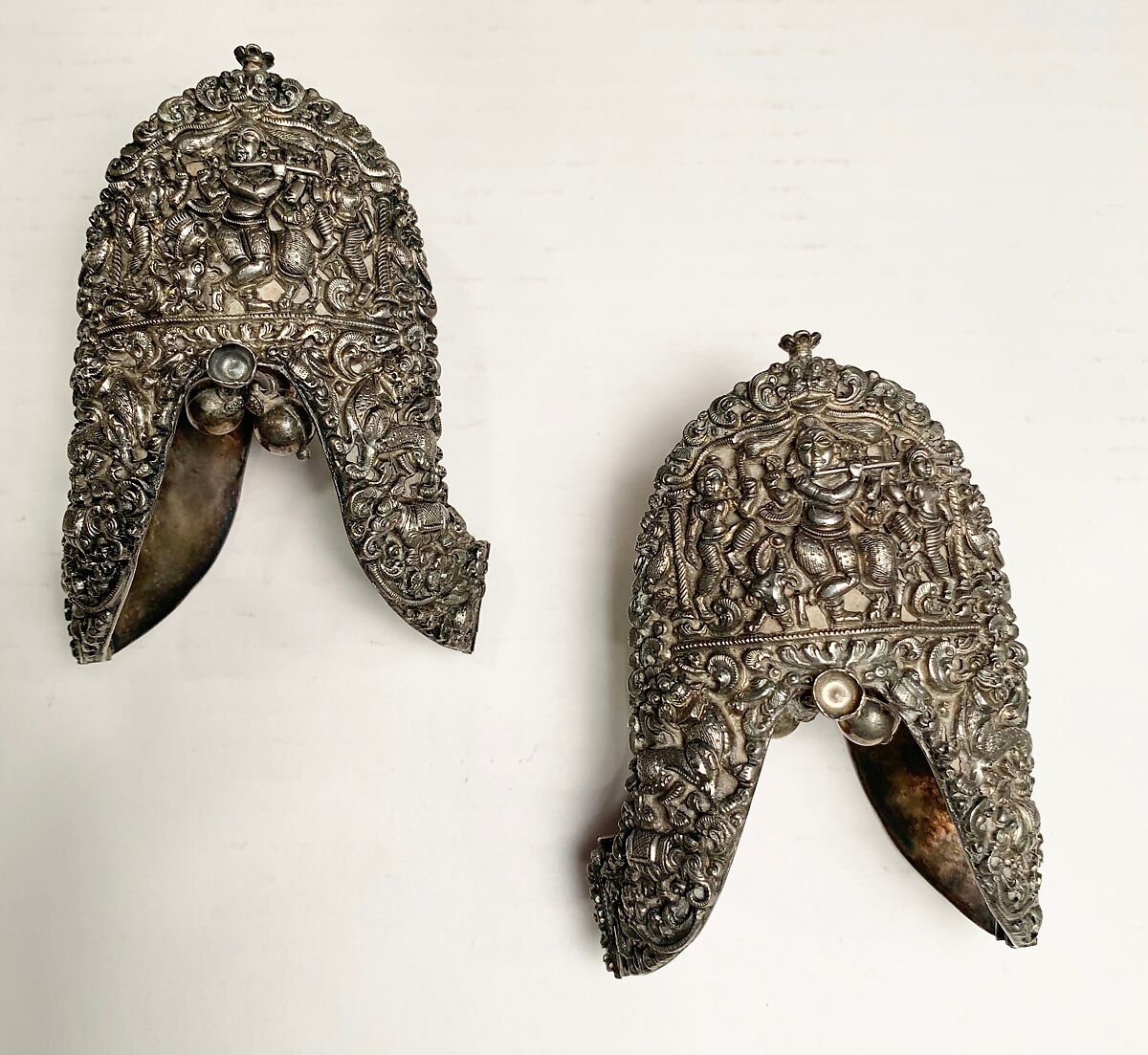 This type of armband (vanki) is in a style that is referred to as swami. Swami metalwork and jewels were produced in southern India during the mid- to late nineteenth century and are characterized by micro-repoussage depictions of the Hindu pantheon of deities. Here, the god Krishna plays the flute and is flanked by animals and gopis (milkmaids).