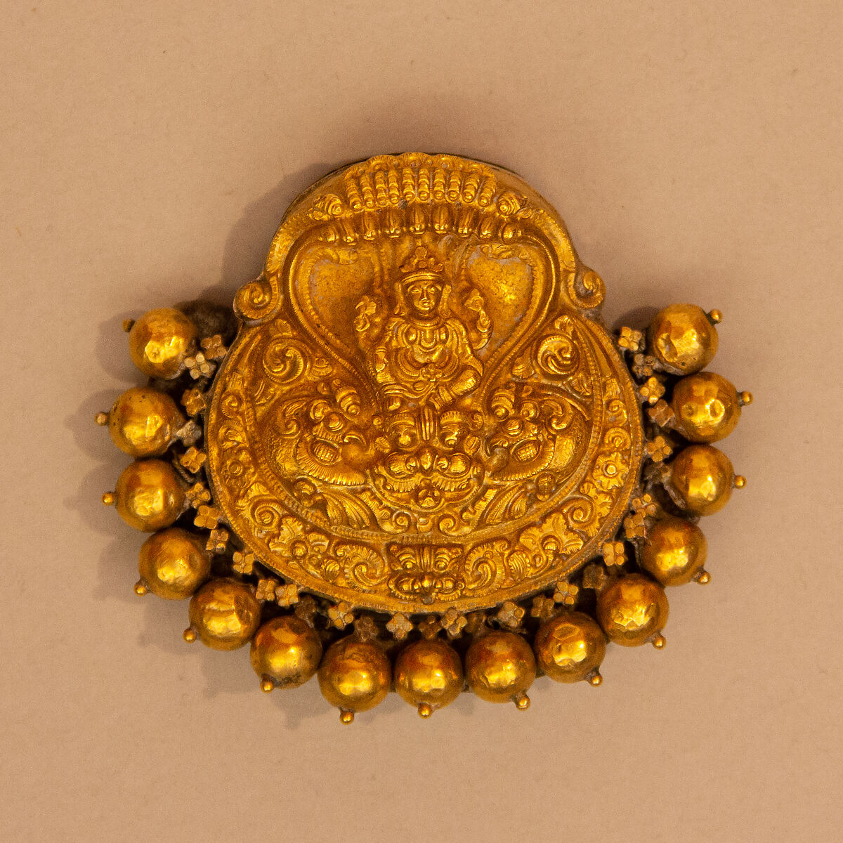 This gold hair ornament would have been worn on the back of the head to adorn the top of a plait, or braid. The iconography features a Hindu goddess (probably Lakshmi, her two upper arms holding blooming lotus flowers) seated beneath a multi-headed snake canopy. This iconography refers to Lakshmi as Vishnu’s consort, where the two reclined in the cosmic ocean under the multiheaded snake Ananta Sesha. Monstrous mask-like faces (kirtimukha) are found at the center and bottom of the jewel and are well-known apotropaic motifs in south India.