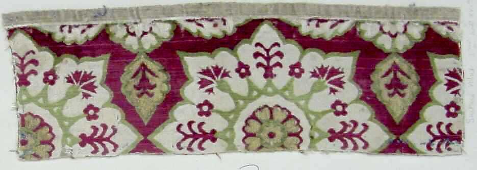 This fragment once belonged to a large rectangular cushion cover with a characteristic repeating floral medallion covering the center field against a dominant red velvet background. A quarter and a half of the repeat-medallion survive in this fragment. Such yastiks were costly velvet furnishing fabrics with glittering metal-wrapped thread used by the Ottoman elite to adorn the interiors of the royal palaces and the homes of the wealthy elite.