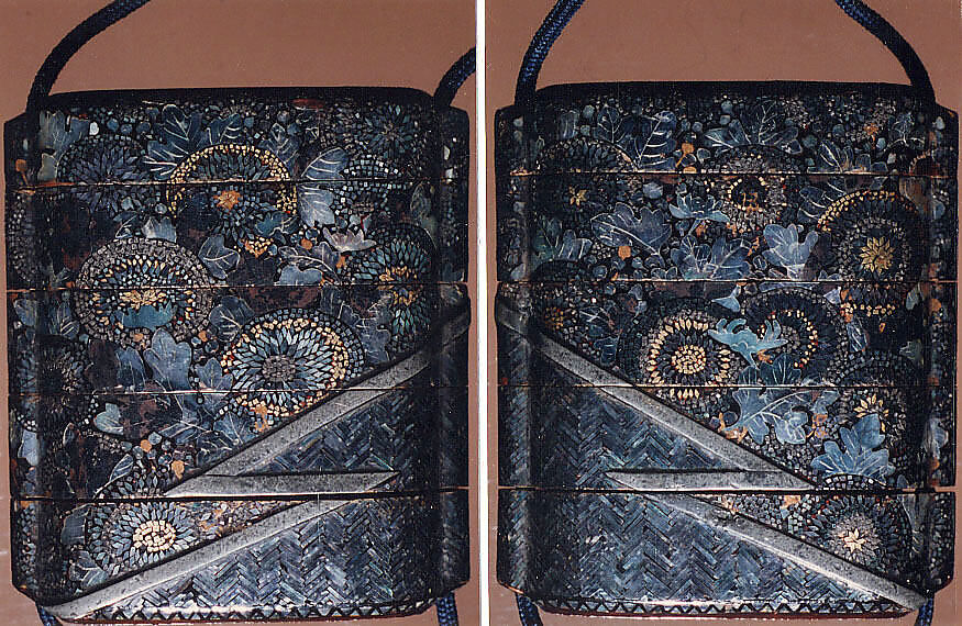 - Medium:Lacquer with mother-of-pearl and pewter; Interior: roiro and fundame; Ojime: gilt iron bead perforated in floral design; Netusuke: mother-of-pearl inlay, ivory, gold, and red and black lacquer in design of flying bird