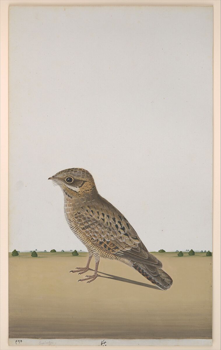 The Nightjar (Caprimulgus asiaticus) is sometimes known as "goat sucker" referring to the myth that these sweet-looking birds sucked on the milk of goats by night. While untrue, nightjars probably got this reputation for the close contact they had with goats while feeding on nearby insects. The artist has rendered each feather individually and marked lines on the legs, while situating the bird in an open landscape complete with tiny trees in the background.