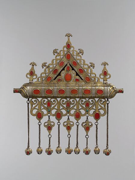 - Medium: Silver; fire-gilded and chased, with decorative wire, ram’s-head terminals, openwork, slightly domed cabochon and table-cut carnelians, turquoise beads, wire chains, and spherical bells