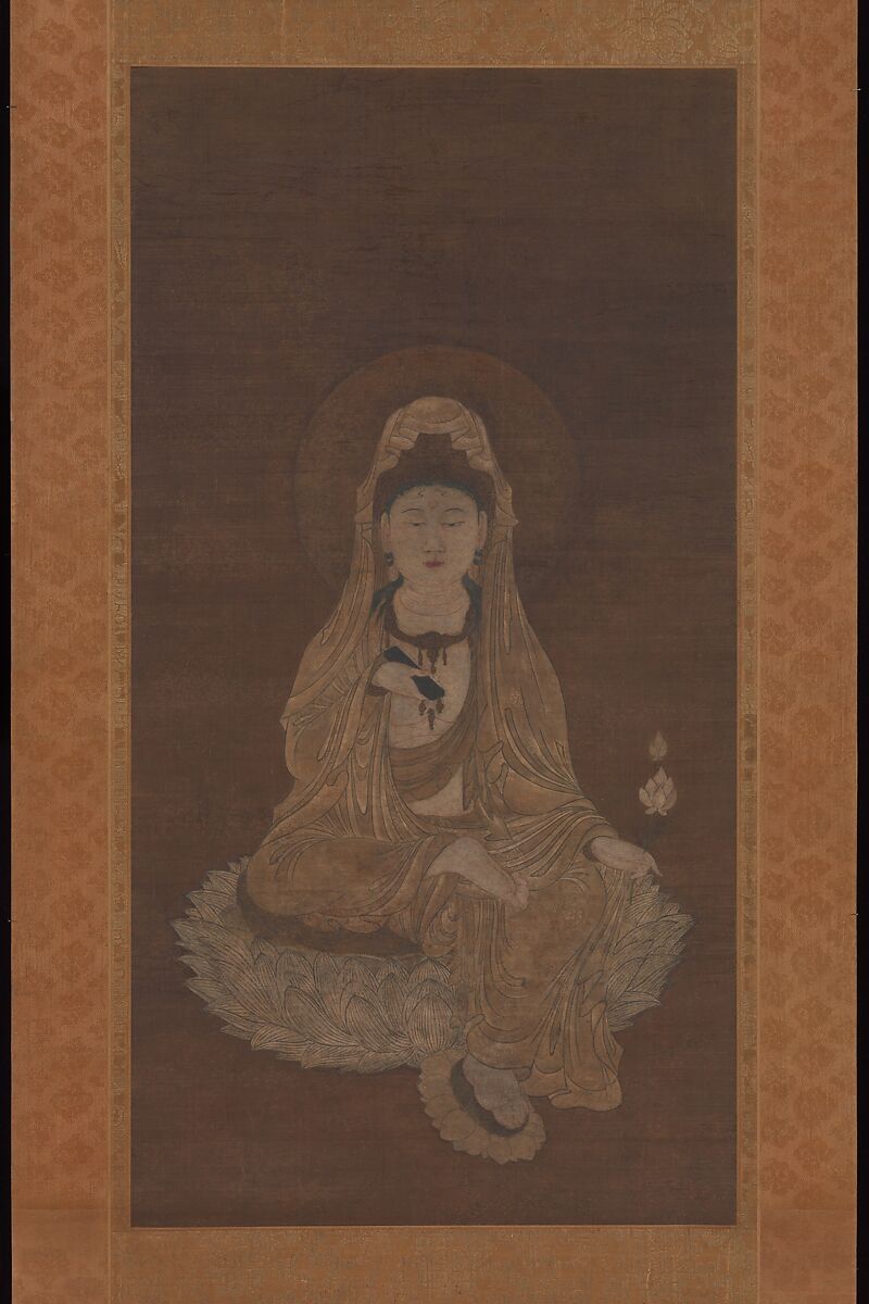This graceful frontal view of Kannon (Sanskrit: Pandaravasini) emphasizes the deity's dignity and compassion. It derives from Esoteric Buddhist iconography that systematically groups deities into mandalas of the two worlds: the Diamond World Mandala and the Womb World Mandala. White-robed Kannon is one of twenty-one Kannon in the Lotus Court section of the Womb World Mandala. The bodhisattva's pose, with one leg pendent, seems to be a precursor to the more relaxed pose he assumes in the monochrome ink painting of White-robed Kannon in a landscape. Here, Kannon, wearing a delicately decorated white robe and sitting on a white lotus pedestal, conforms to the feminized concept of “Mother Kannon,” an aspect of the deity that was developed further in later medieval worship. Some stiffness of line in the robes is probably the result of copying from a model. More fluid brushstrokes in the lotus petals create a sense of volume, a quality that suggests a thirteenth-century date for this work.