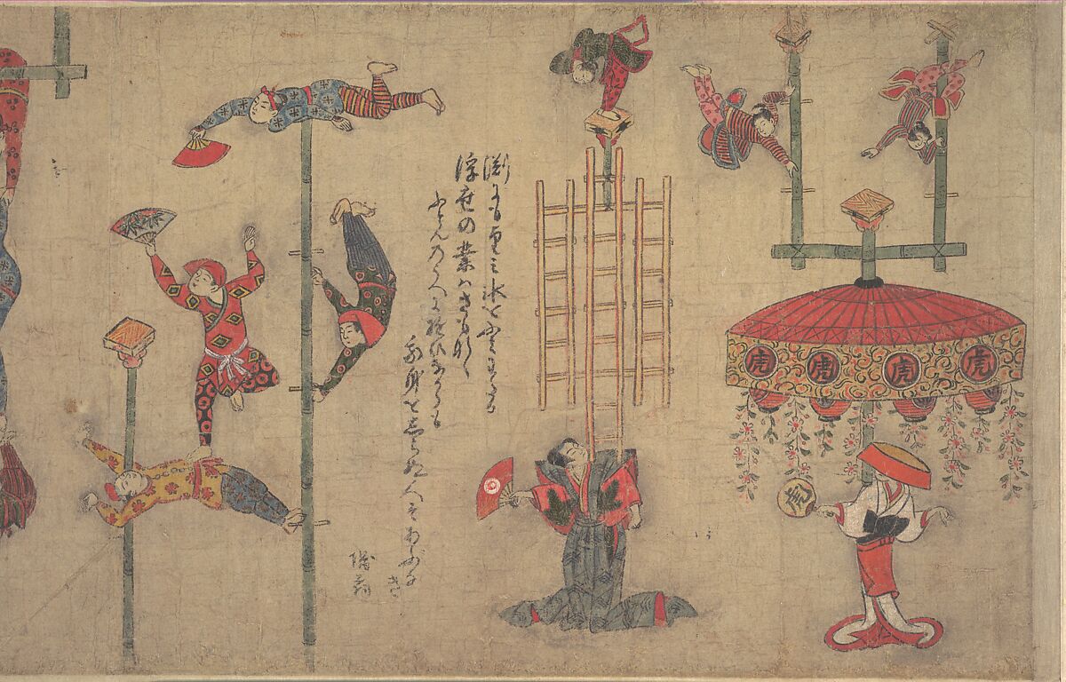 A troupe of acrobats performs remarkable feats, using bamboo poles and supports as props for balancing acts. This form of entertainment came to Japan from China in the seventh century; later, a type of acrobatics called “spider dancing” was sponsored by aristocrats and military leaders. With growing urbanization in the Edo period, acrobats began to perform in cities and towns for the enjoyment of all classes of society. Humorous poems scattered throughout this scroll make comic comparisons between acrobatic feats and the hardships of daily life.