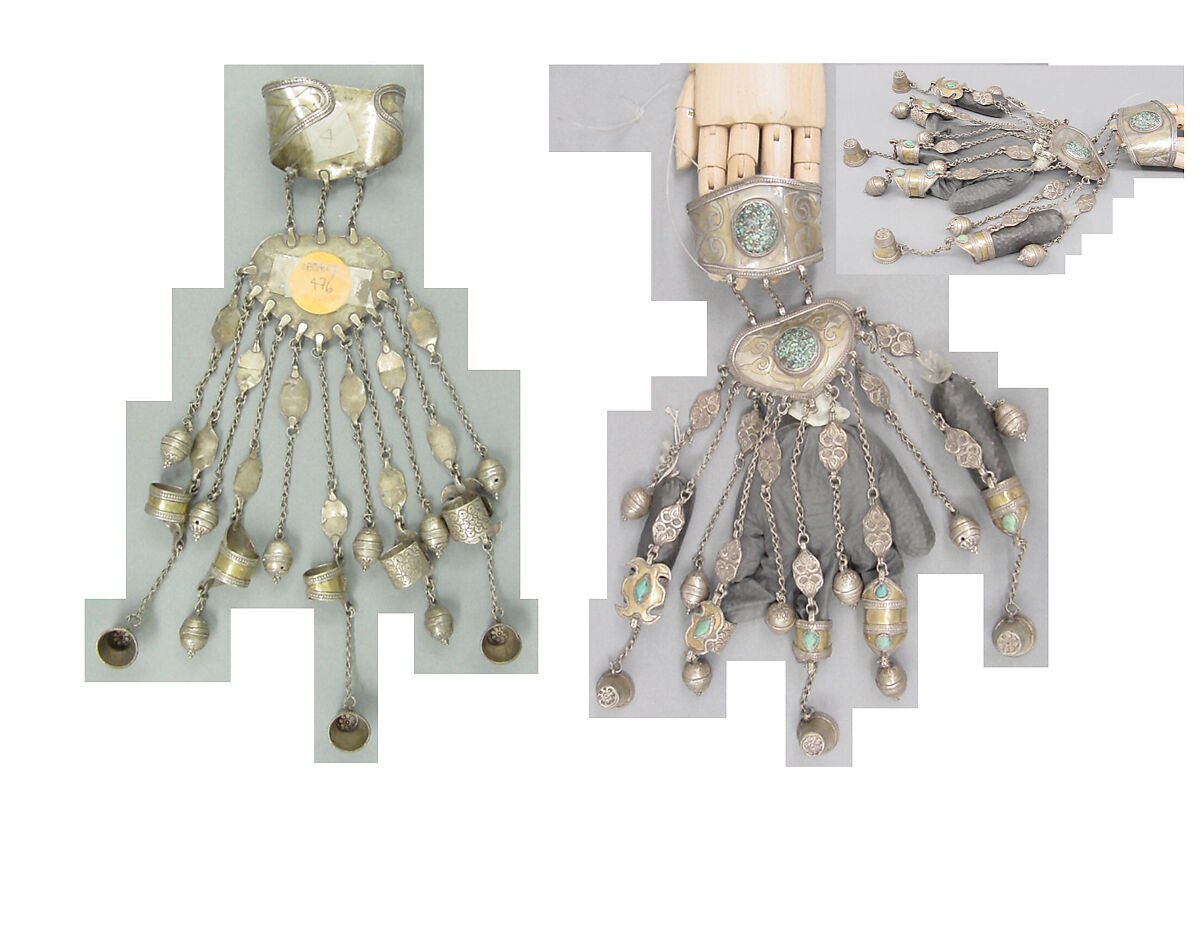 - Medium: Silver, fire-gilded and chased, with decorative wire and applied decoration, loop-in-loop chains with bells, and turquoises