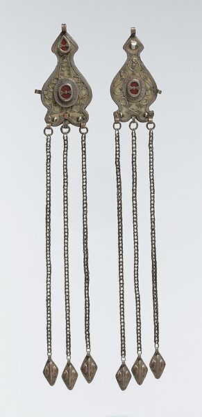- Medium:Silver; fire-gilded, with decorative wire, silver shot, glass stones, and wire chains with embossed pendants