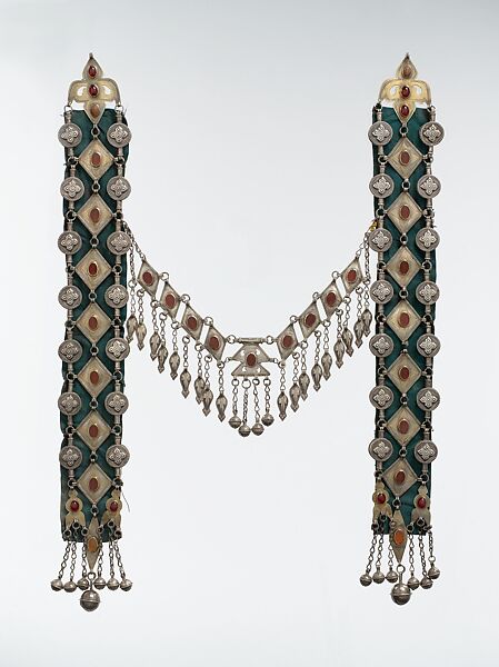 • Medium: Silver, fire-gilded and engraved/punched with stamped, beaded and applique decoration and table cut carnelians and slightly domed carbelians with silver link chains, bells/beads and embossed pendants
