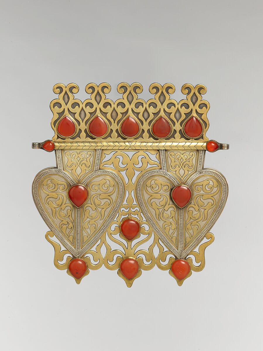 - Medium: Silver; fire-gilded and chased, with decorative wire, openwork, and cabochon carnelians