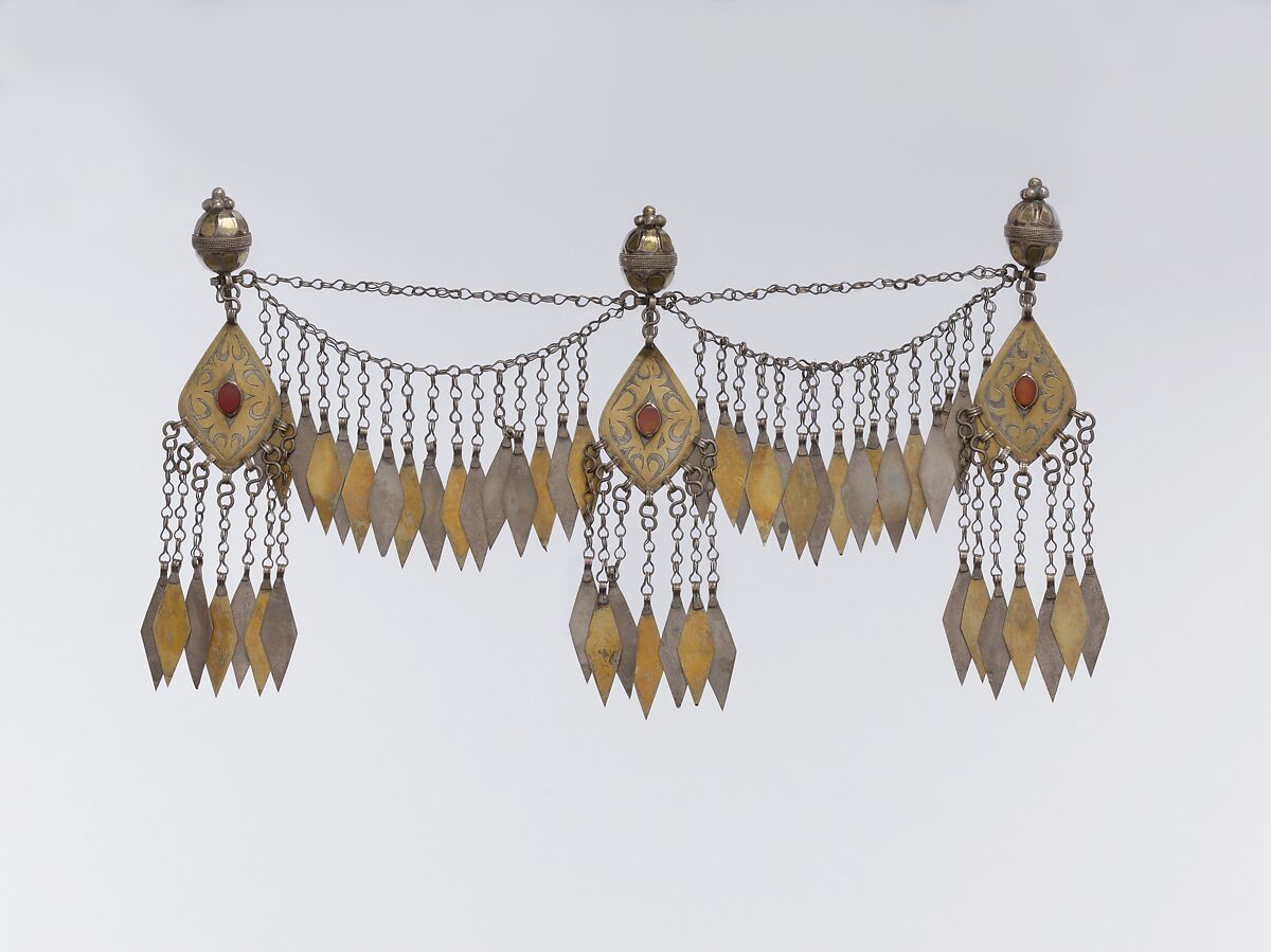 These bold silver ornaments come from the world of the Turkman tribes of Central Asia. Some of the forms such as the lozenge shaped amulet holder or Quran box relate to the styles of jeweled arts of the courts and urban centers. But most of these large and vibrant ornaments are a final expression of the unique sensibility of the Turkman people as their nomadic life gives way to modernity.