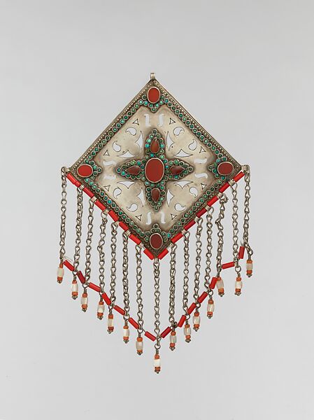 This bold silver ornament comes from the world of the Turkmen tribes of Central Asia. Some of the forms, such as the lozenge-shaped pectoral pieces, relate to the styles of jeweled arts of the courts and urban centers while most of these large and vibrant ornaments are a final expression of the unique sensibility of the Turkmen people as their nomadic life gives way to modernity.