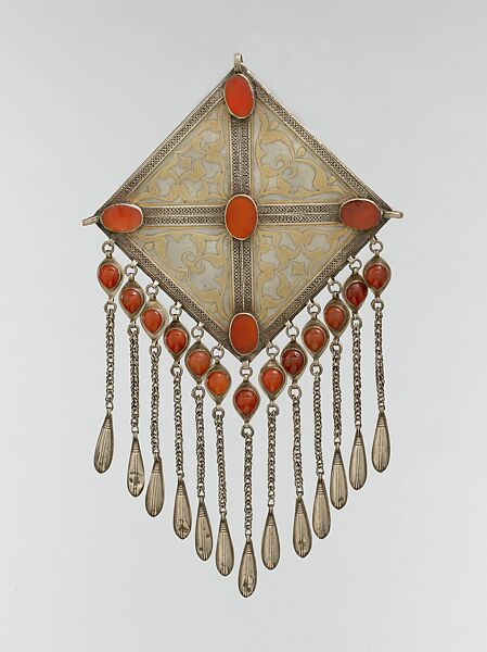 This bold silver ornament comes from the world of the Turkmen tribes of Central Asia. Some of the forms such as the lozenge-shaped pectoral pieces relate to the styles of jeweled arts of the courts and urban centers while most of these large and vibrant ornaments are a final expression of the unique sensibility of the Turkmen people as their nomadic life gives way to modernity.