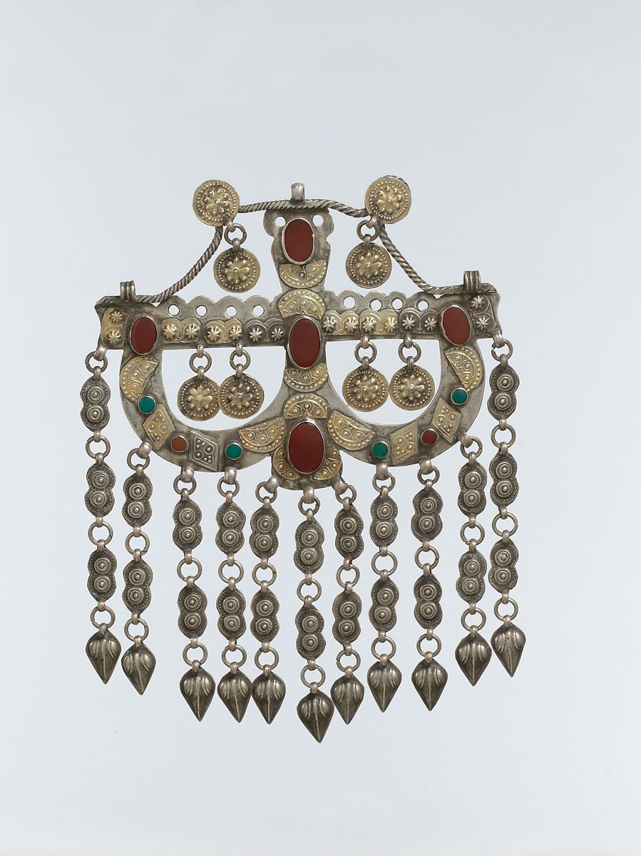 - Medium: Silver, fire-gilded, with applied decoration, twisted wire, connecting links and embossed pendants, table-cut carnelians, and glass stones