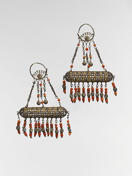 The tubular shape of these earrings is based on the form of amulet holders typically worn by Turkmen women as pectoral ornaments. Such amulets were originally designed to hold scrolls of paper inscribed with holy words or verses from the Qur’an. These earrings evoke the shape of such amulets, though they are pierced and would not have held anything within.