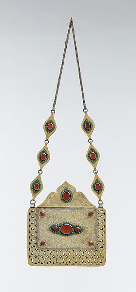 - Medium:Silver; fire-gilded and chased, with openwork, chains, table-cut carnelians, and turquoise beads
