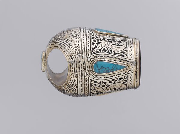 - Medium: Silver; chased, with vegetal and animal motifs, openwork, and inset turquoises