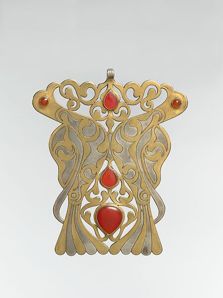 Turkman jewelry is worn because of its protective powers, and its design is not merely guided by aesthetic preference but has specific references in a set of beliefs that predate the conversion of the Turkman tribes to Islam. This ornament is attributed to the Tekke tribe that once inhabited the Achal oasis in the southern part of present-day Turkmenistan, close to the northern border of Iran. While much of the jewelry made by the Turkman tribes combines silver, gilded silver, and carnelians, Tekke pieces are instantly recognizable from the gilded scrolling patterns covering much of their surface and the openwork scrolls used on many, but not all, pieces. The pair of confronted birds that form the main motif of this object is unusual, however. Although birds are commonly used in the jewelry of other Islamic cultures, a parallel for this piece in Tekke jewelry is nearly impossible to find. The form is also unusual. While the piece is similar to a headdress element, its overall size and proportion of height to width suggest that this was a pectoral ornament, probably worn strung together with several other ornaments that covered most of the chest.