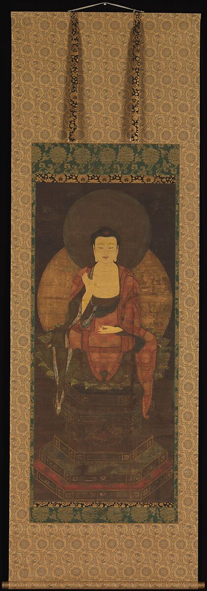 Shaka Nyorai, or the historical Buddha Shakyamuni (the sage of the Shakya tribe who attained enlightenment), lived in India from about 563 to 483 B.C. He is portrayed here sitting cross-legged on a lotus throne above a five-tiered hexagonal pedestal. The most fundamental doctrine of Buddhism, Turning the Wheel of the Law, is embodied in Shaka's hand gesture, the mudra of preaching. He is illuminated by double disks of halos and by gold applied to his face and body. His robes drape gracefully over the throne. The strong frontality and symmetry enhance the strength of this devotional image.