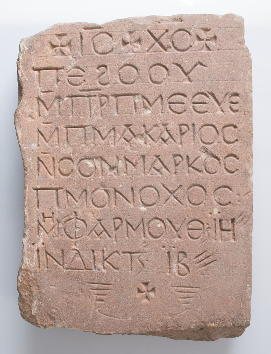 Funerary stelae from the Byzantine period in Egypt are thought to have been produced in quantity, then modified for individual use. Inscriptions were often added to identify the deceased.