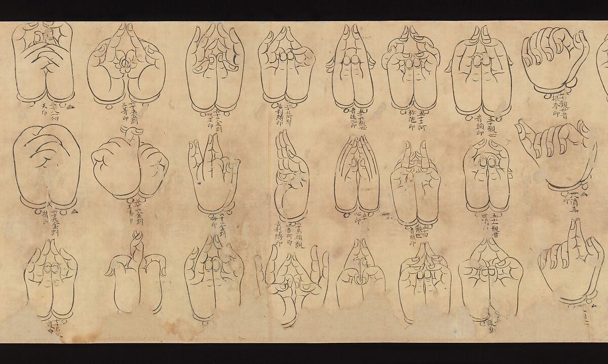 This handscroll depicts hand gestures known as mudras in Sanskrit, the Indian language in which many early Esoteric Buddhist texts were written. In Japan, the gestures are called insō, the Japanese term for a Chinese word that combines the characters for "seal" and "form." In Esoteric Buddhism, mudras are physical enactments of ultimate truths revealed through the buddhas and other deities. Practitioners of Esoteric Buddhism in Japan form mudras during meditation and rituals and use them to interpret the meaning of painted and sculpted Buddhist images. This scroll was passed down in the Kyoto temple Shōren-in, a Tendai School temple traditionally administrated by imperial princes who had taken religious vows.
