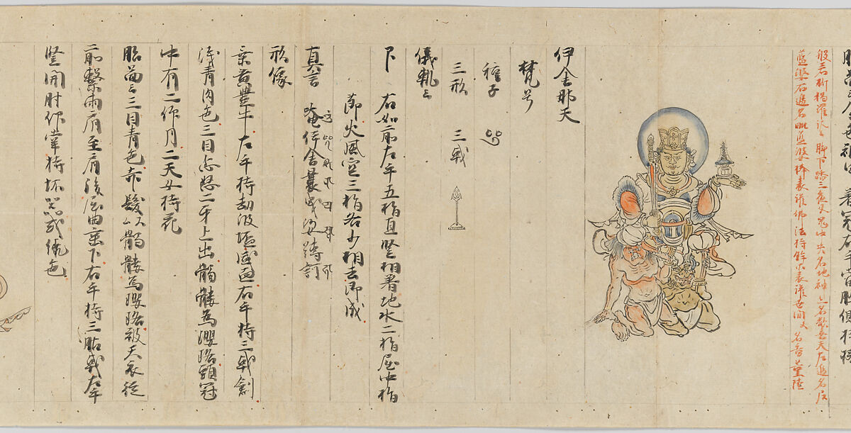 Sketchlike drawings of Buddhist deities in ink and/or light colors played a vital role in transmitting the complex iconography of the multitude of deities who make up the Mikkyō (Esoteric) pantheon. As it is identified on the outside of the scroll, this work contains images of the deva kings (ten in Japanese). Also inscribed on the outside is the scroll's provenance—Kanchi-in, a subtemple of Tōji in Kyoto, an especially rich depository of Esoteric Buddhist images. Included in the scroll are images and descriptions of twenty-four deities, including Shitennō, the guardians of the four cardinal directions, and Jūniten, the Twelve Deva Kings. The deities are identified in the texts preceding their images, which give their names in Chinese characters, their Sanskrit names, seed letters symbolizing their particular virtues, and their special attributes. Monks who later examined the scroll provided punctuation marks and brief commentaries in red ink for the benefit of fellow monks and disciples.