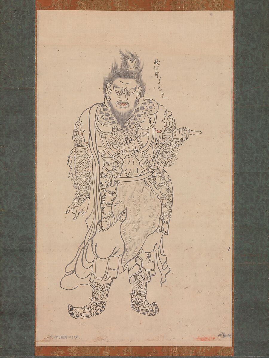 The subject of this iconographic drawing, which originally belonged to Kōzanji, a temple in the mountains northwest of Kyoto, is generally identified as General Anchira (Andira in Sanskrit), one of the twelve guardian generals who dedicated themselves to the Yakushi (Bhaishajyaguru) Buddha. The twelve generals are usually crowned with the twelve animals of the zodiac; here, Anchira has a rabbit on his head.