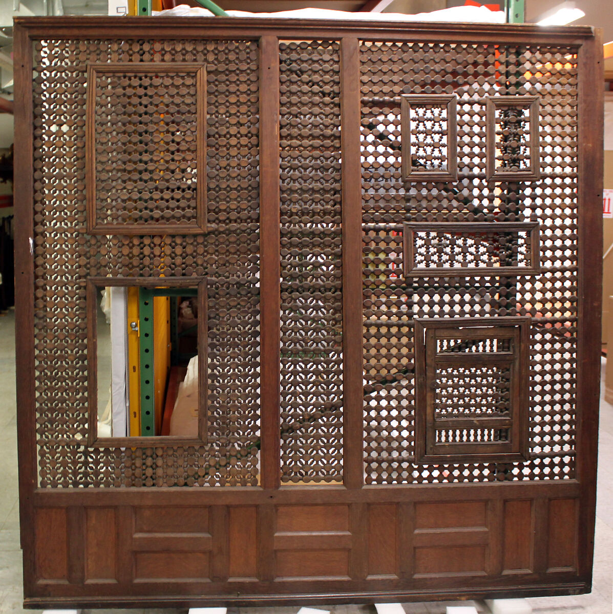 This turned lattice-work screen reveals a mashrabiyya-making technique, the maymoun, meaning "blessed." Other kinds of mashrabiyya-making techniques were also available, such as the salibi, or cross-shaped, technique.